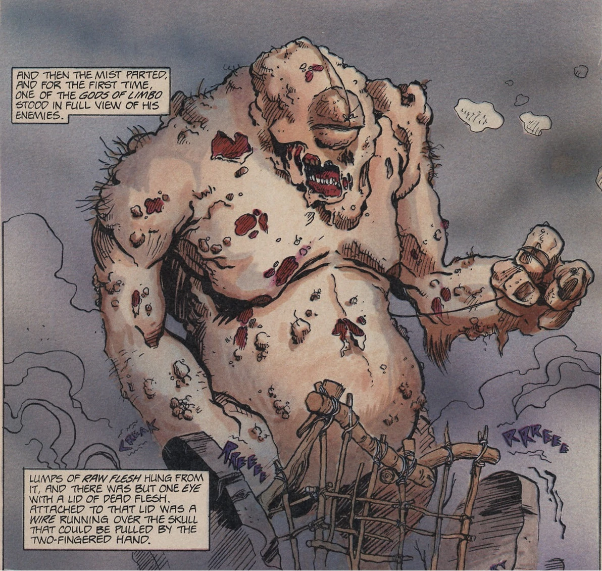 - Describe/narrate as appropriate: uprooted tree as a club, giant rotting fist, filthy serrated bronze knife, boulder hurled from out of the mist, a ponderous cart rolling inexorably over as they ignore you in the fog.
